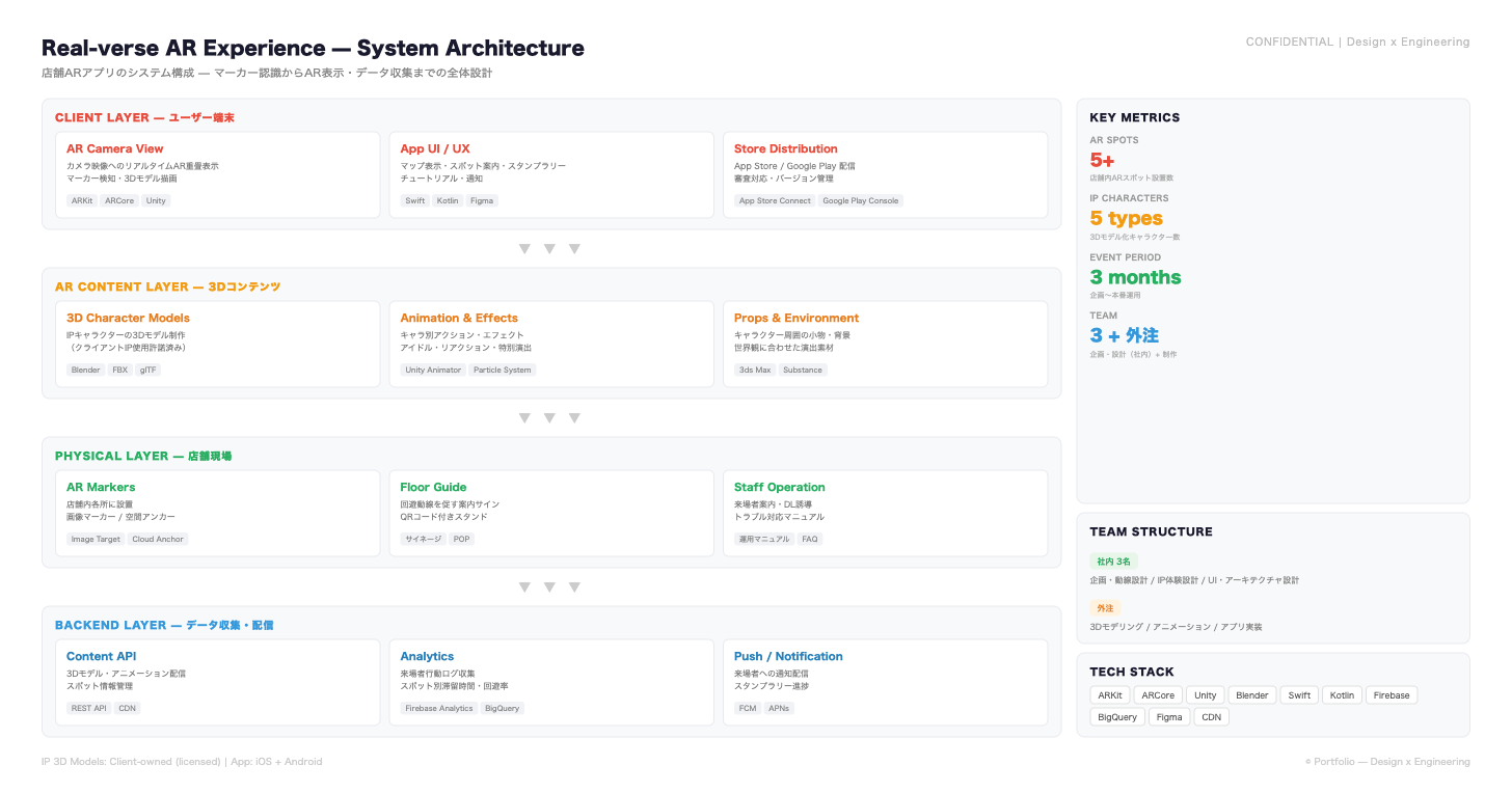 大手テーマパーク運営企業のオフィシャルストアにおいて、自社IPキャラクターの3D ARモデルを店舗空間に出現させる「リアルバース(Real-verse)」体験を企画・設計。メタバースの逆発想で、デジタルキャラクターを現実空間に持ち込み、来場者の回遊性を高めるAR体験を実現。ロケハン・動線分析からキャラクター配置計画、アプリUI/UX設計、システムアーキテクチャ策定、3Dモデル・アプリ実装の外注ディレクション、現地リハーサル・本番運用までを一気通貫で推進。