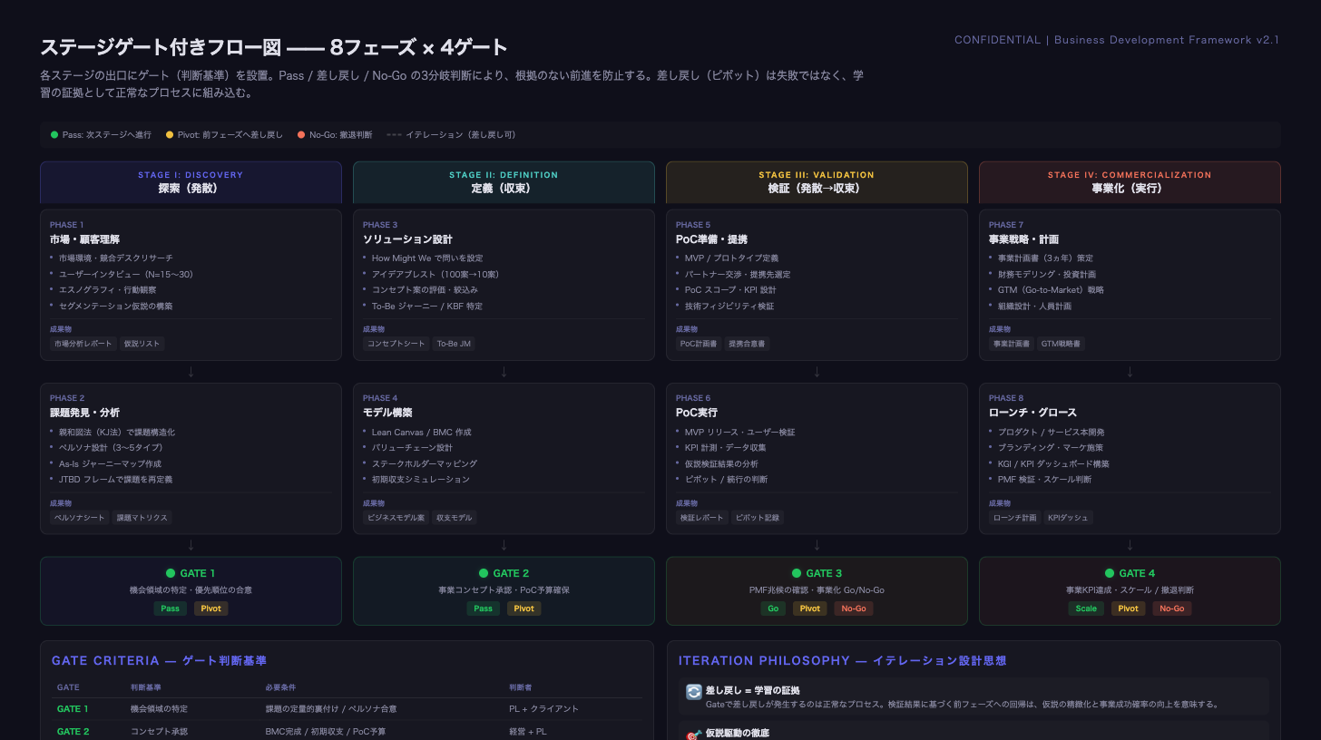 ※画像はイメージですステージゲート付きフロー:8フェーズ × 4ゲート(Pass/Pivot/No-Go)