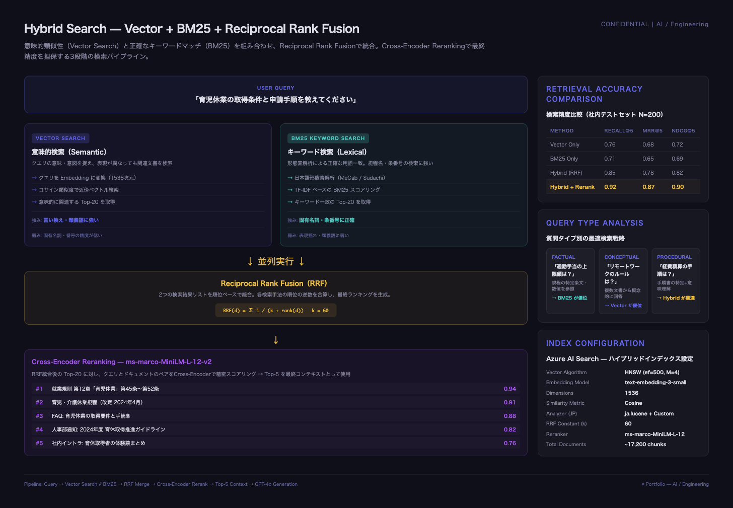 Azure AI Searchのハイブリッド検索機能を活用し、ベクトル検索(意味的類似性)とBM25キーワード検索(正確な用語一致)を並列実行、Reciprocal Rank Fusion(RRF)で統合する検索パイプラインを構築。さらに多言語対応のCross-Encoderでリランキングし、Top-5の高精度コンテキストをGPT-4oに渡して回答を生成する。