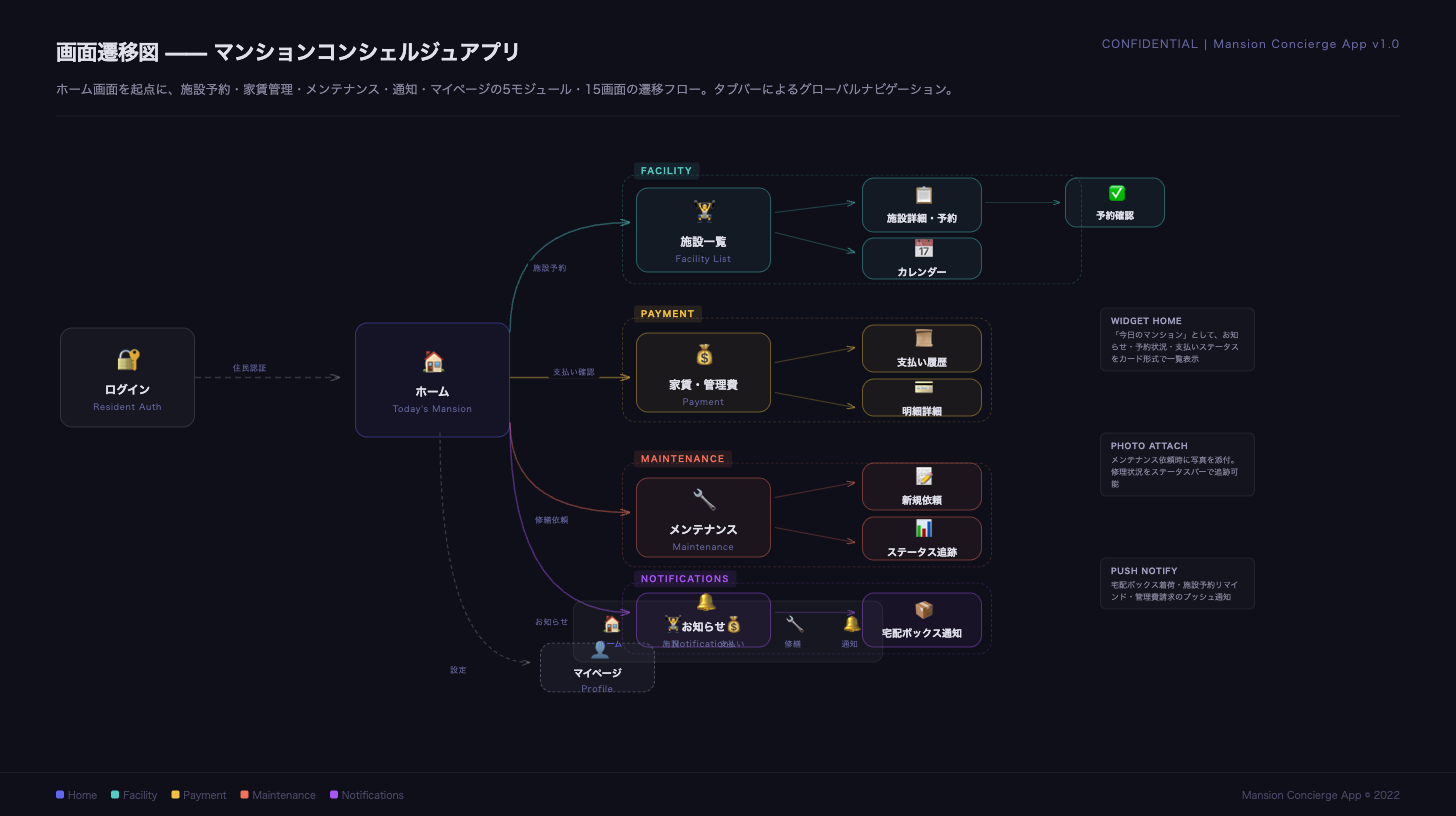 画面設計では、ホーム画面を「今日のマンション」としてお知らせ・予約状況・支払いステータスを一覧表示する構成とした。施設予約(ジム・ラウンジ・ゲストルーム等)、家賃・管理費の確認と支払い、メンテナンス依頼(写真添付・ステータス追跡)、宅配ボックス通知の4つのコア機能をFigmaでインタラクティブプロトタイプとして作成し、住民候補へのユーザビリティテストを実施した。