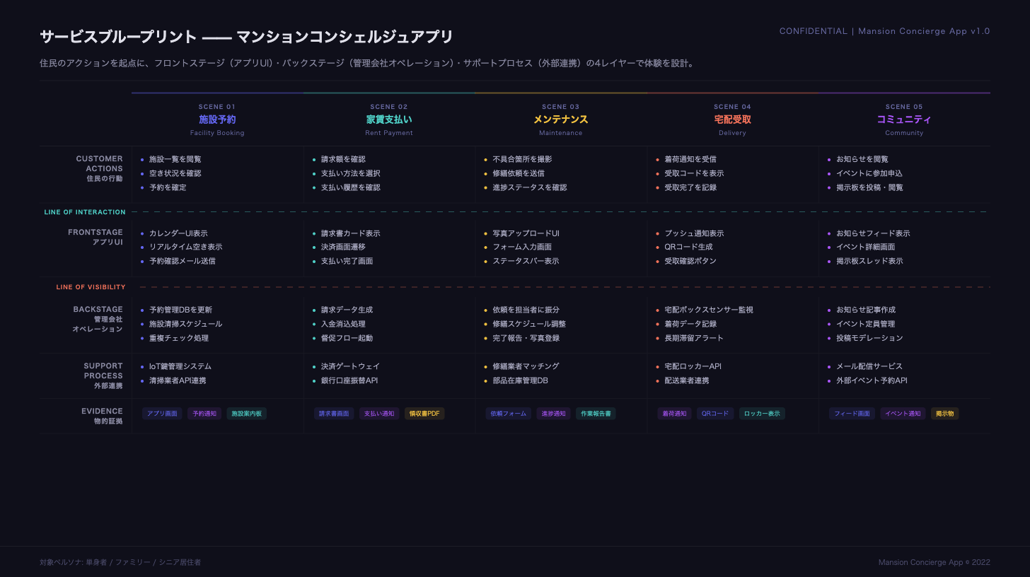 UX設計フェーズでは、住民ペルソナ(単身・ファミリー・シニア)ごとの利用シーンを整理し、サービスブループリントを作成。フロントステージ(アプリUI)とバックステージ(管理会社オペレーション・外部連携API)の接点を可視化した。
