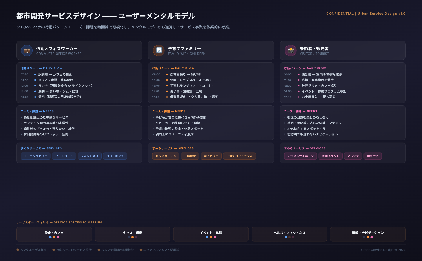 3つのユーザーペルソナ(通勤オフィスワーカー、子育てファミリー、来街者・観光客)を設定し、メンタルモデルを構築。各ペルソナの日常行動・ニーズ・課題を時間軸で可視化し、街区への期待値と行動パターンを分析した。メンタルモデルから逆算してサービス事業を考案(回遊性・コミュニティ形成・生活支援・体験提供)。事業創出ワークショップを設計・ファシリテーションし、ステークホルダー間の合意形成を推進。各サービス事業のフィジビリティスタディ(事業性・運営体制・初期投資の概算)を実施し、優先順位を策定した。
